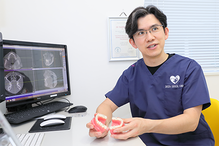 泣いたり、嫌がったりして、治療を行うことができない場合は、歯科診療に慣れてもらうためのトレーニングから始めます。診療椅子に座れないお子さんならまずは座る練習から、治療器具が怖いお子さんなら、器具について説明したり、触れてもらったりして、少しずつ慣れてもらいます。お子さんとの信頼関係が何よりも大切なので、できるだけわかりやすい言葉を使って、優しくお話しするように心がけています。